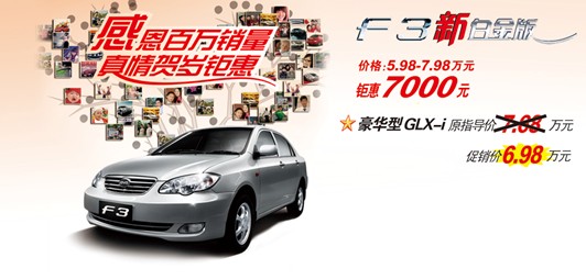 注:在促銷價(jià)基礎(chǔ)上,F(xiàn)3全系車型還可享受3000元/輛的政策補(bǔ)貼