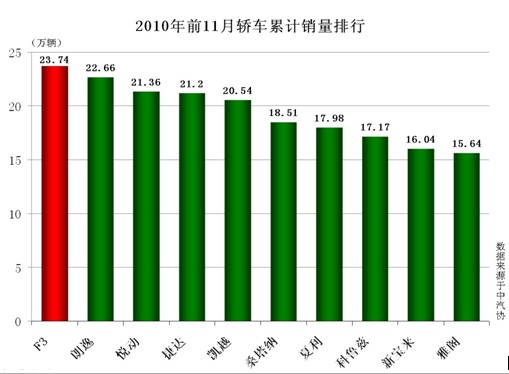 根據(jù)中汽協(xié)數(shù)據(jù)顯示,2010年1月-11月,比亞迪F3累計(jì)銷售23.74萬輛,以明顯的優(yōu)勢榮膺單車銷售冠軍。F3在2010年前11月保持熱銷狀態(tài)并取得銷量冠軍的寶座,得益于冠軍般的品質(zhì),冠軍般的服務(wù)。年末的給力鉅惠,將使F3的冠軍地位更加不可動搖。