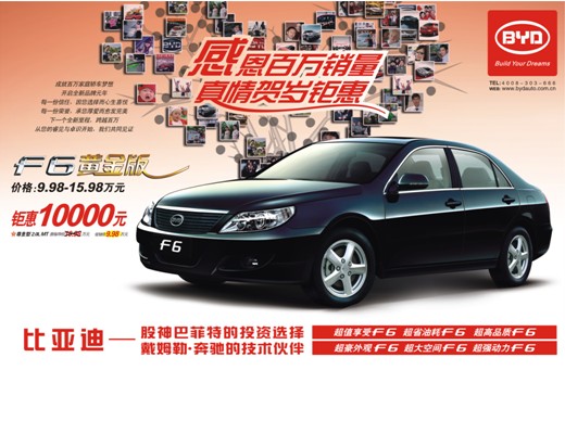 自去年底領(lǐng)銜比亞迪五款車(chē)型舉行“感恩百萬(wàn)銷(xiāo)量 真情賀歲鉅惠”活動(dòng)以來(lái),F(xiàn)6黃金版憑借“凱凱黃金定律” 的全面超值優(yōu)勢(shì),以最高鉅惠1萬(wàn)元的攻勢(shì)掀起了中高級(jí)車(chē)市的年末購(gòu)車(chē)潮,市場(chǎng)反響熱烈,銷(xiāo)售異;鸨。數(shù)據(jù)顯示,F(xiàn)6全年銷(xiāo)量突破50000臺(tái),穩(wěn)居中高級(jí)汽車(chē)市場(chǎng)主流陣營(yíng)。