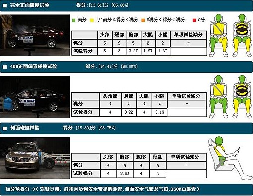 報(bào)告顯示,帝豪EC7在正面100%重疊剛性壁障碰撞試驗(yàn)、可變形移動(dòng)壁障側(cè)面碰撞試驗(yàn)、正面40%重疊可變形壁障碰撞試驗(yàn)中分別獲得13.61分、14.41分、15.8分。此外,帝豪EC7還憑借駕駛員側(cè)、前排乘員側(cè)安全帶提醒裝置、側(cè)面安全氣囊及氣簾、ISOFIX兒童座椅裝置等等豐富的安全配置獲得了3分的加分總成績(jī)?yōu)?6.8分。值得注意的是,從得分分布來(lái)看,EC7的安全性能比較均衡,在每一個(gè)單項(xiàng)中都能得到優(yōu)秀以上的成績(jī)。