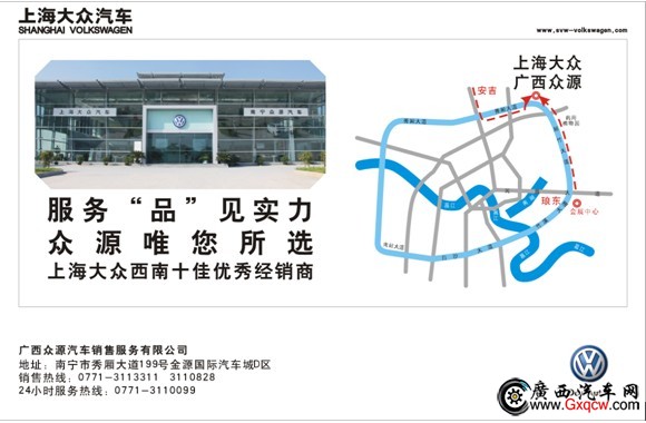 上海大眾廣西眾源4S店,作為2011年度上海大眾西南十佳優(yōu)秀經(jīng)銷商。我們將不斷站在新的高度上為廣西大的上海大眾車友們著想,致力于為上海大眾車主們不斷提供更高的服務(wù)標(biāo)準(zhǔn)。為更多的上海大眾汽車車主和廣大車友提供一個(gè)舒適、尊貴的汽車服務(wù)會(huì)所。