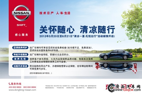 夏季出行,東風(fēng)日產(chǎn)廣緣科園店為了給您與您的愛車最大的關(guān)懷,清涼一夏關(guān)懷您的用車生活:
