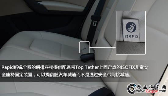Rapid昕銳全系的后排座椅提供配備帶TopTether上固定點的ISOFIX兒童安全座椅固定裝置,能使兒童安全座椅與汽車結(jié)合為一體,可以提前隨汽車減速而不是通過安全帶間接減速。此外,其三點式固定方式是公認(rèn)的最安全的兒童安全座椅固定方式。