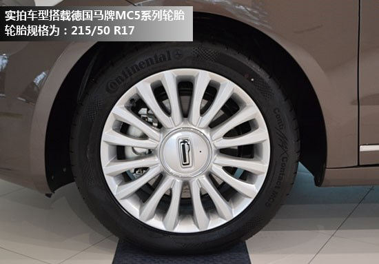 觀致3全系車型采用馬牌輪胎,實拍車型搭載德國馬牌MC5系列輪胎,輪胎規(guī)格為:215/50 R17。這類輪胎不僅皮實耐用,靜音效果也比較好。