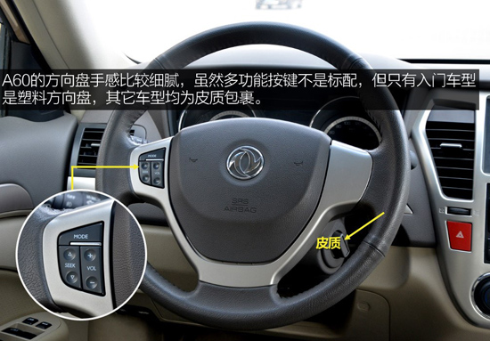 A60的方向盤采用了三幅式設(shè)計(jì),多功能按鍵涵蓋了藍(lán)牙電話、定速巡航等功能,不過(guò)這些功能僅出現(xiàn)在高配車型上。