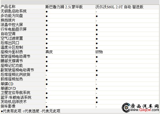斯巴魯力獅相比較S60L多出了無(wú)鑰匙啟動(dòng)、換擋撥片、液晶中控大屏、座椅記憶功能、前排座椅加熱、導(dǎo)航和倒車影像,S60L則多出了后排座椅比例放倒、單碟DVD和發(fā)動(dòng)機(jī)啟停技術(shù),力獅整體更偏向于舒適性,而S60L在空間靈活性和節(jié)油性方面表現(xiàn)的更好。