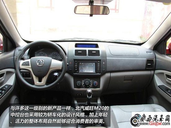 與許多這一級別的新產品一樣,北汽威旺M20的中控臺也采用較為轎車化的設計風格,加上年輕、活力的整體布局自然能夠迎合消費者的審美。上深下淺的顏色搭配也凸顯居家生活氣息,符合整車的定位。雖然為硬塑材質,但整體做工水準令人驚喜。