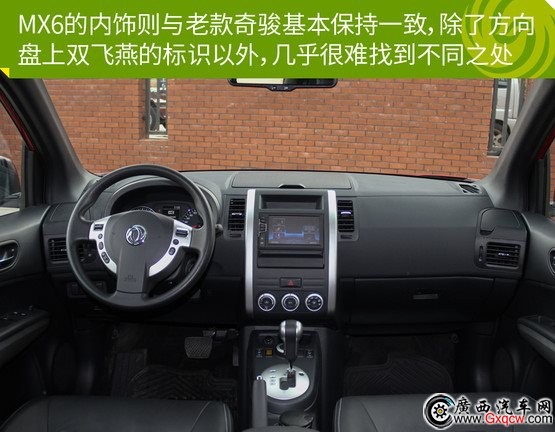 東風(fēng)風(fēng)度MX6的內(nèi)飾則與老款奇駿基本保持一致,除了方向盤上雙飛燕的LOGO以外幾乎很難找到不同之處。不僅樣式上沒有改變,而且用料以及做工上也很好的保持了老款奇駿的水準(zhǔn),中控臺大面積使用軟質(zhì)搪塑包裹,檔次感絲毫沒有打折的感覺。配置上,包括倒車影像、胎壓監(jiān)測、電加熱座椅、定速巡航、座椅兩側(cè)氣囊及側(cè)氣簾、AVM全景監(jiān)控影像系統(tǒng)以及全自動恒溫空調(diào)在內(nèi)等配置都裝配在了東風(fēng)風(fēng)度MX6車型上。