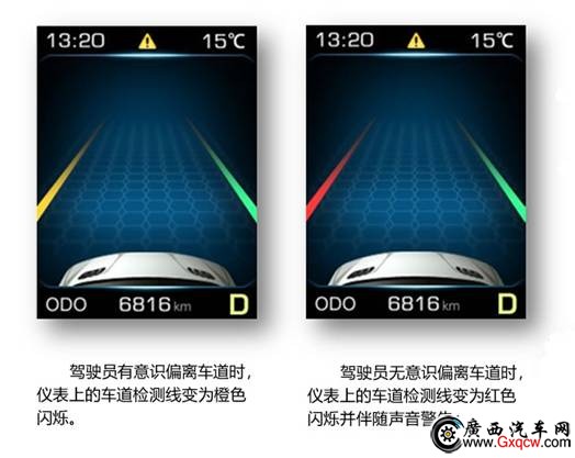 當(dāng)車輛在兩側(cè)車道線清晰且光線充足的道路上行駛時(shí),駕駛員由于走神、疲勞、打電話等原因造成車輛緩慢駛出本車道時(shí),該系統(tǒng)便會(huì)發(fā)出提醒,并觸發(fā)車輛報(bào)警。車道偏離系統(tǒng)能夠有效的區(qū)分車輛有意識和無意識的車道偏離,有意識的偏離車道只提醒不報(bào)警,而無意識的車道偏離時(shí)則會(huì)啟動(dòng)報(bào)警功能。