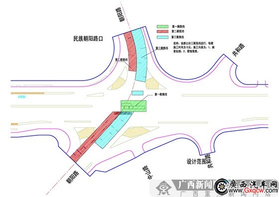 該路口按分塊分段實施:第一階段自6月16日至7月5月全封閉施工,施工工期20天。全封閉景秀路口(民族大道至白云路)只允許非機動車通行,禁止機動車通行。南側先圍擋中間約6車道寬度,禁止車輛由青秀路直行至景秀路,只允許車輛左、右轉民族大道。施工內容:過路管預埋,路基病害處理,渠化島改造,進水井,路緣石安裝,人行道鋪磚,底層瀝青攤鋪。