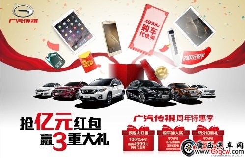 一重禮:預(yù)購大紅包。凡訂購GS4、GA8、GA6、GS5 Super,有最低888元、最高4999元的現(xiàn)金紅包;訂購GA3S有最低666元,最高999元的現(xiàn)金紅包,100%中獎不怕?lián)尣坏!現(xiàn)金紅包到店購車即可抵扣車款。