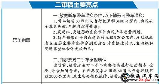 對發(fā)動機(jī)、變速器的主要零件出現(xiàn)產(chǎn)品質(zhì)量問題的,國家相關(guān)規(guī)定可以更換零件,二審稿則明確可以整車退換。