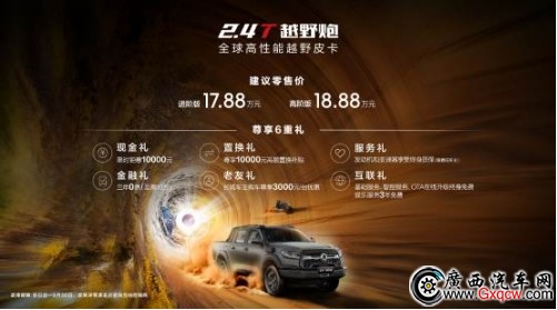 近日,長城炮品類創(chuàng)新力作——全球高性能皮卡2.4T長城炮,包括2.4T越野炮、2.4T乘用炮、2.4T商用炮,三款新車均已到達各地經(jīng)銷門店全面開售。2.4T越野炮進階版官方建議零售價17.88萬元、高階版官方建議零售價18.88萬元;2.4T乘用炮官方建議零售價13.58萬元-16.88萬元,2.4T商用炮官方建議零售價12.58萬元-13.88萬元,購車用戶還可享受現(xiàn)金禮、金融禮、置換禮、服務禮、老友禮、互聯(lián)禮(限2.4T越野炮與2.4T乘用炮)六重大禮,價值拉滿,誠意十足。