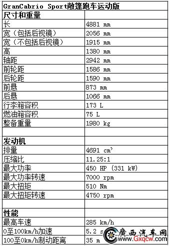瑪莎拉蒂GranCabrio MC敞篷跑車采用了全新4.7升V8發(fā)動機,其輸出功率可達338 kW(460馬力),在4,750 rpm的轉速下,*大扭矩可達到520 Nm。90度直角活塞采用了與發(fā)動機氣缸相同的強化硬質鋁質材料。帶有五點平衡功能的曲軸,則采用高強度鋼制成。全新動力單元與MC Auto Shift自動變速箱相結合,在軟頂閉合的狀態(tài)下,可使瑪莎拉蒂GranCabrio MC敞篷跑車的*高時速達到289 km/h,0-100 km/h的加速時間僅為4.9秒。