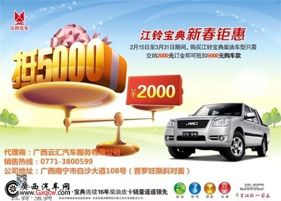 陽(yáng)春三月,春暖花開。江鈴寶典超值鉅惠三月繼續(xù)火熱進(jìn)行,即寶典皮卡柴油車型交2000元訂金即可抵5000元購(gòu)車款,相當(dāng)于直接優(yōu)惠3000元購(gòu)車現(xiàn)金!機(jī)會(huì)不是時(shí)時(shí)有,如此鉅惠不容錯(cuò)過(guò)!你、還在等什么?小伙伴們速來(lái)圍觀!!!歡迎各位到店訂購(gòu)!