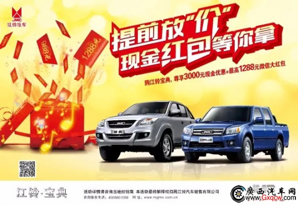 江鈴寶典提前放“價”,截止11月30日到廣西云匯汽車白沙4S店購江鈴寶典系列車型均可享受現(xiàn)金讓利3000元再加微信抽紅包,微信紅包*高可達1288元抽取金額可直接抵扣車款。欲購車的朋友趕快到店選購吧!咨詢熱線:0771-3800599.