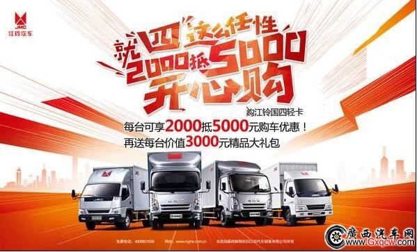 據(jù)獲悉,即日起至2017年6月30日期間到廣西江鈴安吉4S店購買江鈴輕卡國四車型即可享受2000元抵5000元現(xiàn)金優(yōu)惠,同時還贈送價值3000元精品大禮包(僅限活動期間)!驚喜多多!感興趣的朋友可以到店選購啦!
