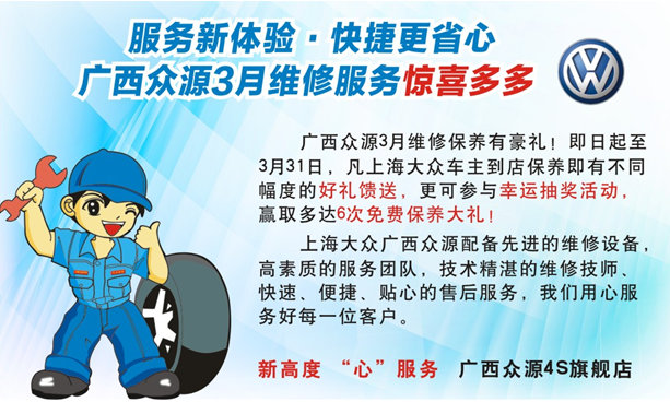 廣西眾源3月維修保養(yǎng)有豪禮!3月3日-31日,凡上海大眾車主到店保養(yǎng)即有不同幅度的好禮饋送,更可參與幸運(yùn)抽獎(jiǎng)活動(dòng),贏取多達(dá)6次免費(fèi)保養(yǎng)大禮!