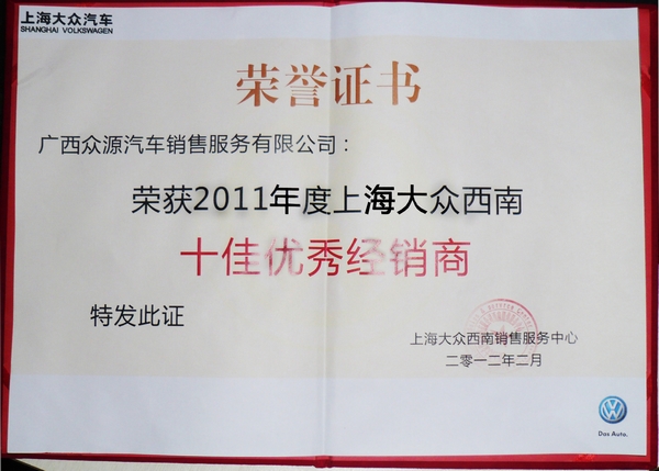 農(nóng)歷新年剛過,喜訊接踵而來。我廣西眾源汽車銷售服務(wù)有限公司榮獲2011年度上海大眾西南“十佳優(yōu)秀經(jīng)銷商”的稱號。一分耕耘一分收獲,把我的真心放在您的手心,眾源與你一路同行!