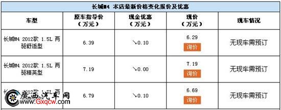 新年新氣象,馬年,馬上訂新車!廣西長道特別推出,長城M4*高現(xiàn)金優(yōu)惠1000元,送豪華禮包,顏色可選,感興趣的朋友可以到店咨詢購買,詳情見下表: