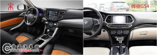 移步到車(chē)內(nèi),兩車(chē)在內(nèi)飾方面設(shè)計(jì)造型差異比較大。宋采用了搪塑高檔軟內(nèi)飾,再搭配上橙黑雙色皮座椅以及視野更開(kāi)闊的全景天窗,體驗(yàn)非常棒。GS4的中控臺(tái)設(shè)計(jì)層次感強(qiáng),但硬塑材料的使用一下拉低了檔次。