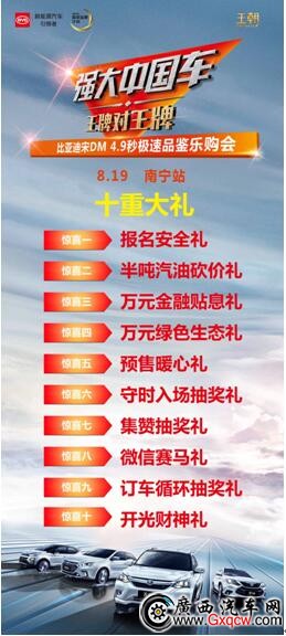 “強(qiáng)大中國車 王牌對王牌”比亞迪宋DM 4.9秒極速品鑒樂購會(南寧站),即將在8月19日盛大開啟。宋DM 4.9秒極速來襲!五星安全SUV宋、元、S7等全系車型現(xiàn)金鉅惠!O2O購車體驗(yàn)享多達(dá)十重大禮:950元交強(qiáng)險、千元油卡、萬元貼息、萬元電費(fèi)、華為P10、洗衣機(jī)、登機(jī)箱等!7月購車**時機(jī),限時2小時南寧市大學(xué)城試駕場