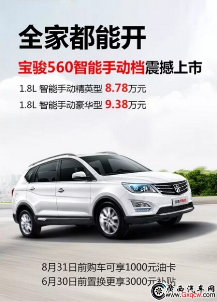 2016年6月8日,定位為“全家都能開”的寶駿560智能手動(dòng)檔正式上市。此次推出的1.8L智能手動(dòng)精英型和1.8L智能手動(dòng)豪華型售價(jià)分別為8.78萬(wàn)元、9.38萬(wàn)元。新車型在傳統(tǒng)手動(dòng)變速器基礎(chǔ)上,增加了電子系統(tǒng)TCU和換擋執(zhí)行器,取消了離合器踏板,用戶只需切換擋位即可輕松駕駛,是目前為止市場(chǎng)上**開、技術(shù)**的手動(dòng)擋產(chǎn)品,開創(chuàng)了全新的手動(dòng)駕駛模式!