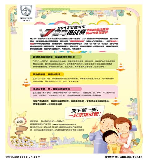 隨心駕馭,馳騁“V”彎,展示寶駿汽車“國際品質(zhì)新家橋”,體驗新車產(chǎn)品特點,寶駿與您攜手,為伙伴贏得勝利,2012寶駿汽車V型彎挑戰(zhàn)賽,開戰(zhàn)在即!