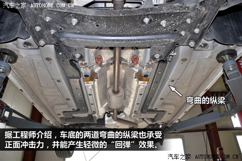 據(jù)工程師介紹,車底的兩道縱梁彎曲的縱梁也是傳遞沖擊力的途徑,并且在這一過程中,彎曲的縱梁還可以產(chǎn)生輕微的抑制沖擊效果。