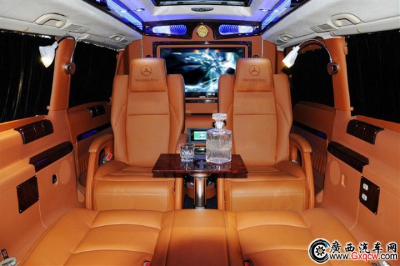 后艙前部是兩個全尺寸的航空頭等艙豪華座椅,講到這個座椅真的要好好說一下,看似簡單的座椅卻包含著奔馳工程師孜孜不倦的努力。整張座椅采用全手工縫制, 材料選用來自巴伐利亞地區(qū)18個月大的小牛皮,精制而成,皮質(zhì)硬中帶軟,紋路均勻,透氣性極好。為了坐的更舒適,奔馳工程師通過多達87次的試驗,結(jié)合各 種身高,各種體重的人體特點,設(shè)計了現(xiàn)在的這張座椅,無論乘坐者的身高是多少,體重是多少,座椅的弧度都將和身體完美的貼合,對每一寸肌膚都襯托到位,坐 上去,將會感覺到前所未有的舒適。座椅可以360度旋轉(zhuǎn),配合可拆卸桌板,組合形式多種多樣。兩個座椅的后面是一張采用相同皮質(zhì)的3人座沙發(fā),坐感同樣舒 適,只需輕輕一按,在10秒鐘的時間,它可以變成一張1M7*1M4的雙人床,通過和前排座椅的對接,長度可以達到2M2,當然,相信后部座椅可以平放成 床這樣的設(shè)計很多商務(wù)車都采用,但奔馳的這張床,請仔細看,它并沒有完全放平,這就是奔馳高科技和人性化的完美結(jié)合,它采用了黃金5度角的設(shè)計,通過科學 研究證明,人體在這樣的角度上休息是最完美的,幾乎接近在太空中的睡眠感覺。試想一下,躺在這樣的床上休息,看著車頂漫天的星星,就像彷佛置身在太空中, 絕對有身臨其境的感覺!