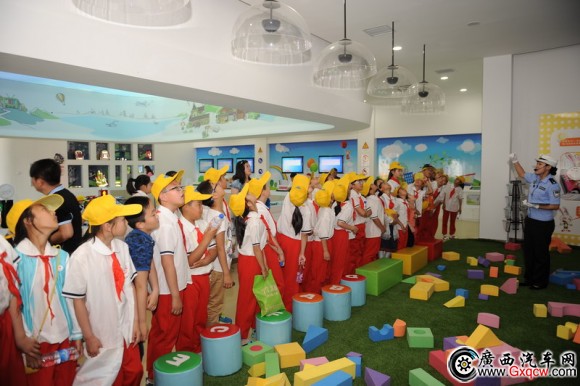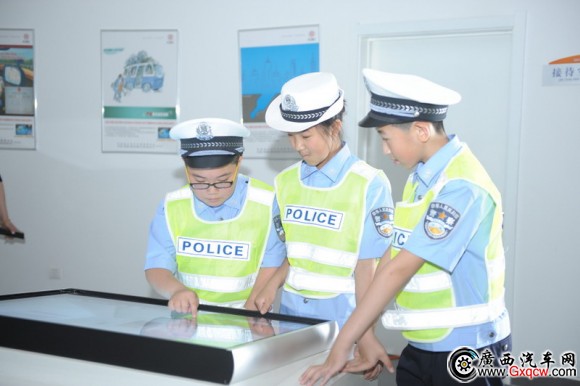 身著制服的小學(xué)生們在互動區(qū)內(nèi)利用多媒體設(shè)備學(xué)習(xí)交通法規(guī)