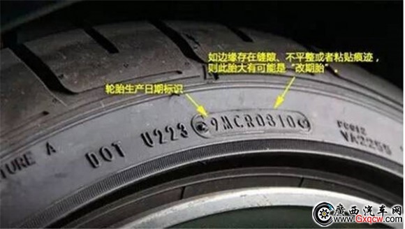 2.標(biāo)志是否齊全:觀察花紋代碼和輪胎花紋是否對(duì)應(yīng),胎肩處的胎面與胎體結(jié)合是否平順?如果不平順則為翻新胎。