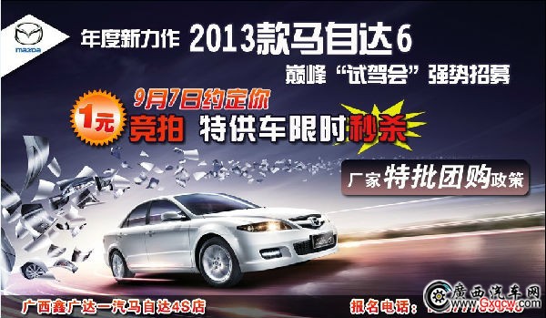 9月7日鑫廣達(dá)一汽馬自達(dá)深度試駕會(huì),馬自達(dá)六12.98萬(wàn)起售,優(yōu)惠空前!活動(dòng)當(dāng)日***賽車手將給您帶來(lái)720度漂移特技表演,并全程陪同您試乘試駕。特價(jià)購(gòu)車活動(dòng)精彩紛呈:千元紅包派送、現(xiàn)場(chǎng)抓現(xiàn)金、多款高值商品1元競(jìng)拍、特供車限時(shí)秒殺、廠家特批團(tuán)購(gòu)政策,訂車誠(chéng)意金翻10倍送,讓您只賺不賠!