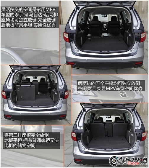 馬自達(dá)5的車內(nèi)空間十分充裕。坐椅采用“6+1”布局,那張“+1”坐椅位于第二排位置的中間,放下是坐椅,收起來(lái)則是一個(gè)通道,這樣一來(lái),后面兩排的乘客就可以來(lái)回走動(dòng),帶有老人和小孩出行的話,方便照顧。