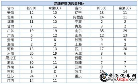 東風風神新S30/帝豪EC7全國專營店數(shù)量對比