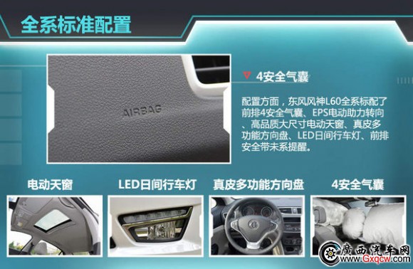 配置方面,東風風神L60全系標配了高品質大尺寸電動天窗、前排4氣囊、EPS電動助力系統(tǒng)、真皮多功能方向盤、LED日間行車燈、前排安全帶未系提醒。而高配車型還有無鑰匙進入、大尺寸液晶屏、車機智能互聯(lián)系統(tǒng)、藍牙電話、倒車影像、EBD電子制動力分配等科技系統(tǒng),配置豐富、實用。